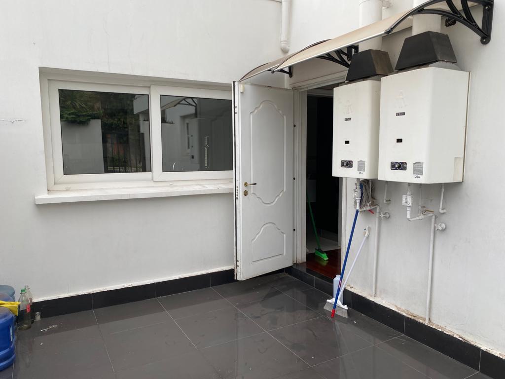 En la planta baja, se encuentran una pieza de lavandería y un dormitorio de servicio con baño. También hay un patio interior cerrado y dos calefones. Además, se dispone de un baño de visitas completo con ducha.