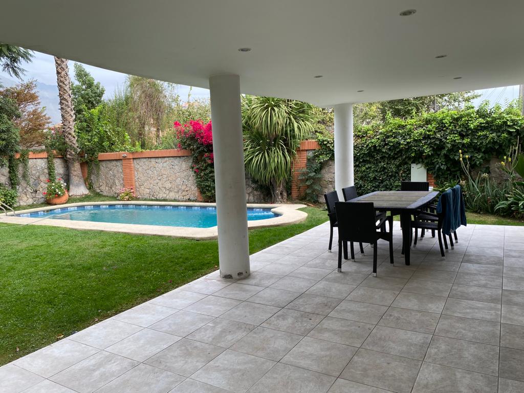 La casa ofrece una gran terraza que da al jardín trasero, donde se encuentra una piscina con filtro subterráneo y un quincho. El jardín está cuidadosamente consolidado con plantas ornamentales, árboles frutales y una añosa palmera.